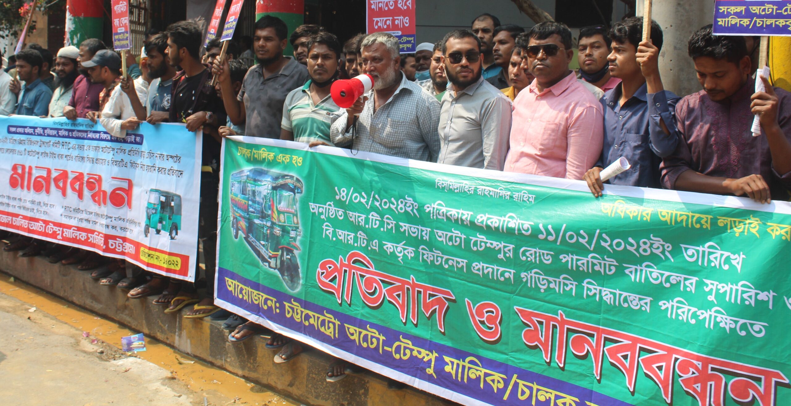 ৯০০টি অটো টেম্পু গাড়ি আরটিসি কর্তৃক বাতিলের সুপারিশের প্রতিবাদে চট্টমেট্রো অটো টেম্পু মালিক কল্যাণ সমিতির উদ্যোগে চট্টগ্রাম প্রেস ক্লাবের সামনে প্রতিবাদ ও মানববন্ধন অনুষ্ঠিত হয় আজ সকাল ১১ টায়।