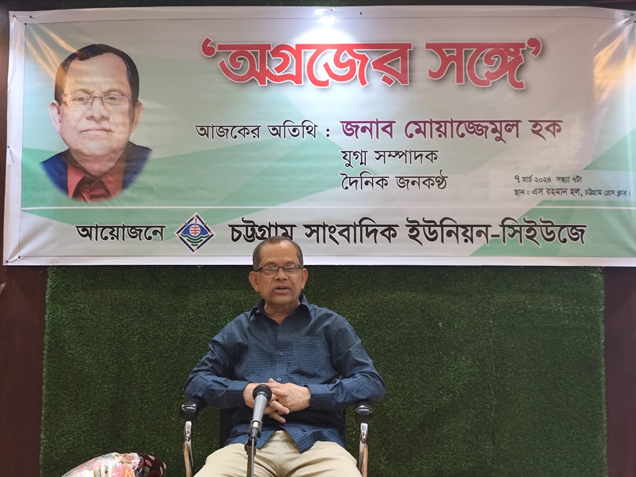 চ্যানেল ২৪ এর আঞ্চলিক সম্পাদক কামাল পারভেজের সঞ্চালনায় অনুষ্ঠানে স্বাগত বক্তব্য দেন চট্টগ্রাম সাংবাদিক ইউনিয়নের সাধারণ সম্পাদক ম. শামসুল ইসলাম। অনুষ্ঠানের শুরুতে চট্টগ্রাম সাংবাদিক ইউনিয়নের নির্বাহী কমিটির পক্ষ থেকে মোয়াজ্জেমুল হককে ফুল দিয়ে শুভেচ্ছা জানানো হয়। অনুষ্ঠানে সমাপনী বক্তব্য রাখেন চট্টগ্রাম সাংবাদিক ইউনিয়নের সভাপতি তপন চক্রবর্তী। এছাড়া ‘অগ্রজের সঙ্গে’অনুষ্ঠান নিয়ে বক্তব্য রাখেন চট্টগ্রাম প্রেস ক্লাবের সাবেক সভাপতি কলিম সরওয়ার ও সাবেক সাধারণ সম্পাদক ফারুক ইকবাল।