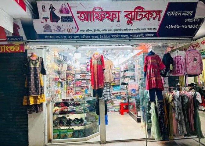 চট্টগ্রামের পাহাড়তলী সি.ডি. এ মার্কেট সংলগ্ন মৌচাক প্লাজার ২য় তলা, দোকান নং -৮৬’তে আফিফা বুটিকস শোরুম। ছবি - দৈনিক নয়াবাংলা[/caption]