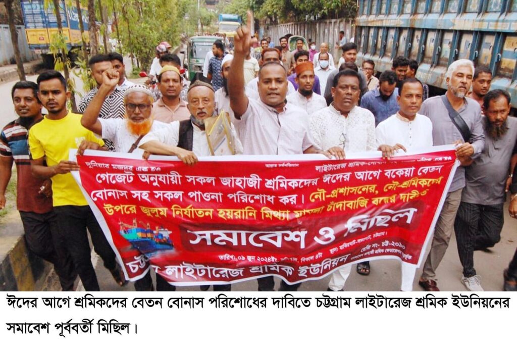 গেজেট অনুযায়ী সকল জাহাজী শ্রমিকদের ঈদের আগে বকেয়া বেতন বোনাস সহ সকল পাওনা পরিশোধ করার দাবি জানিয়ে মানৰ বন্ধন ও মিছিল করেছে চট্টগ্রাম লাইটারেজ শ্রমিক ইউনিয়নের শ্রমিকরা।