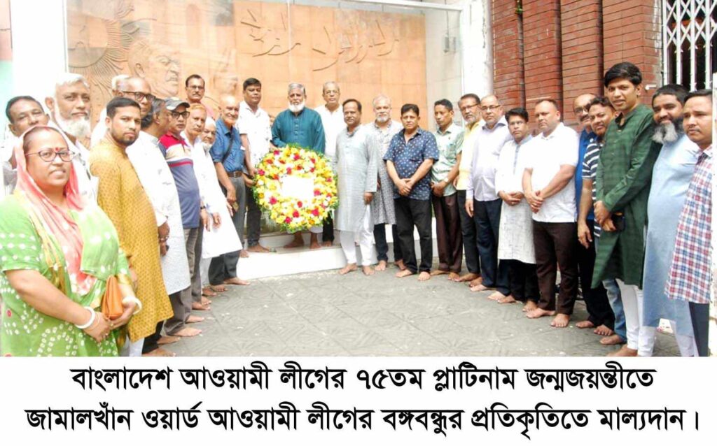 বাংলাদেশ আওয়ামী লীগের গৌরবের অভিযাত্রায় ৭৫তম প্লাটিনাম জন্মজয়ন্তীতে ২১নং জামালখান ওয়ার্ড আওয়ামী লীগের উদ্যোগে আজ সকাল ১১ টায় নগরীর প্রেসক্লাবস্থ বঙ্গবন্ধুর প্রতিকৃতিতে ওয়ার্ড আওয়ামী লীগের সভাপতি আবুল হাশেম বাবুলের সভাপতিত্বে ও সাধারণ সম্পাদক মিথুন রশ্মি বড়–য়ার পরিচালনায় পুস্পমাল্য প্রদান করেন।